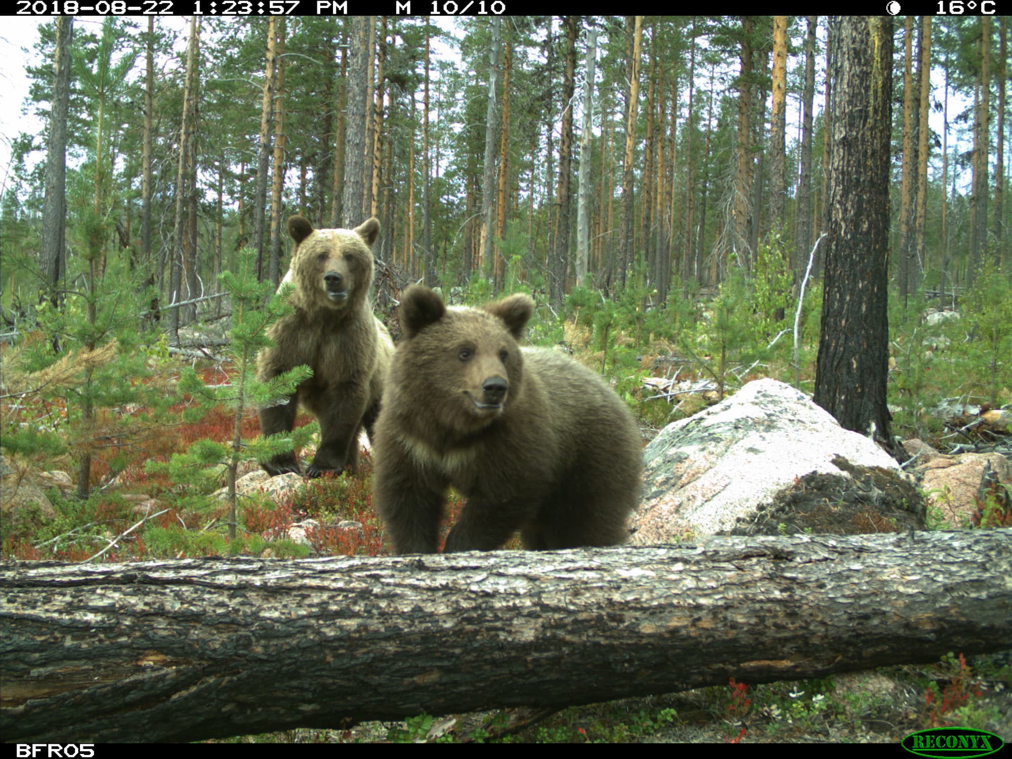 Two brown bears (mother and yearling) captured by a camera trap in Sweden. Image by SLU.